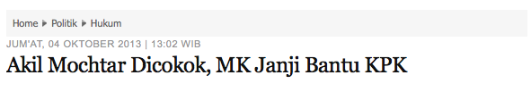 Untunglah, tatkala zaman berlalu, segera kita lupakan kata “diamankan”. Maka tatkala Ketua Mahkamah Konstitusi Akil Mochtar ditahan oleh KPK, tidak ada lagi orang jang menggunakan istilah dia telah “diamankan”, walaupun orang jakin dalam tahanan dia tidak akan disiksa. Sekarang kita memilih menggunakan kata “ditjokok”, karena selain blak2an, kata ini djelas djuga tidak mengandung kemunafikan. Dengan menggunakan “ditjokok” kita berkesempatan untuk menundjuk betapa munafiknja Akil Mochtar, Chairun Nisa, dan tiga orang lain jang pada Rabu malam 2 Oktober itu ditangkap KPK. “Ditjokok” atau paling sedikit “ditangkap” adalah djuga wudjud dukungan umum pada KPK jang begitu tangkas menindak pelaku tindak kriminal korupsi. Di lain pihak kasus korupsi dalam tubuh Mahkamah Konstitusi djuga telah mentjoreng kepertjajaan masjarakat pada lembaga peradilan. Padahal sedjak orde baru tersingkir, lembaga peradilan sudah, sedikit demi sedikit, mulai mandiri dari tjampur tangan pihak exekutif atau legislatif. Kemandirian itu berarti peradilan dipertjaja hanja mendasarkan vonisnja se-mata2 pada hukum dan pasal2 undang2nja, tidak lagi melajani pesanan kalangan luar. Ketika kedapatan ternjata masih ada saja pihak jang mengchianati kepertjajaan itu, maka masjarakat tidak segan2 lagi menghundjamkan kata “ditjokok” (artinja diringkus atau diborgol) terhadap mereka jang djadi pesakitan.