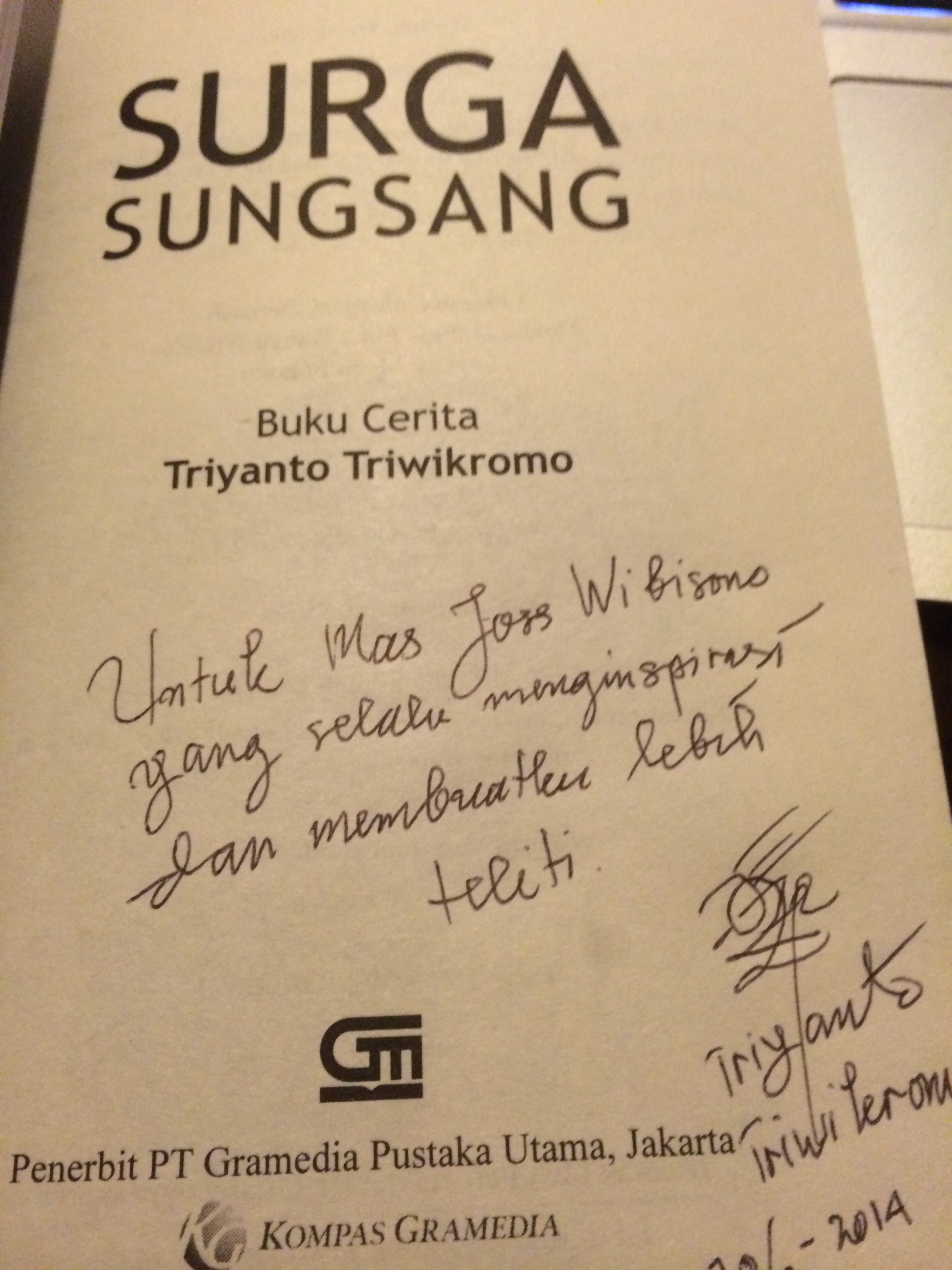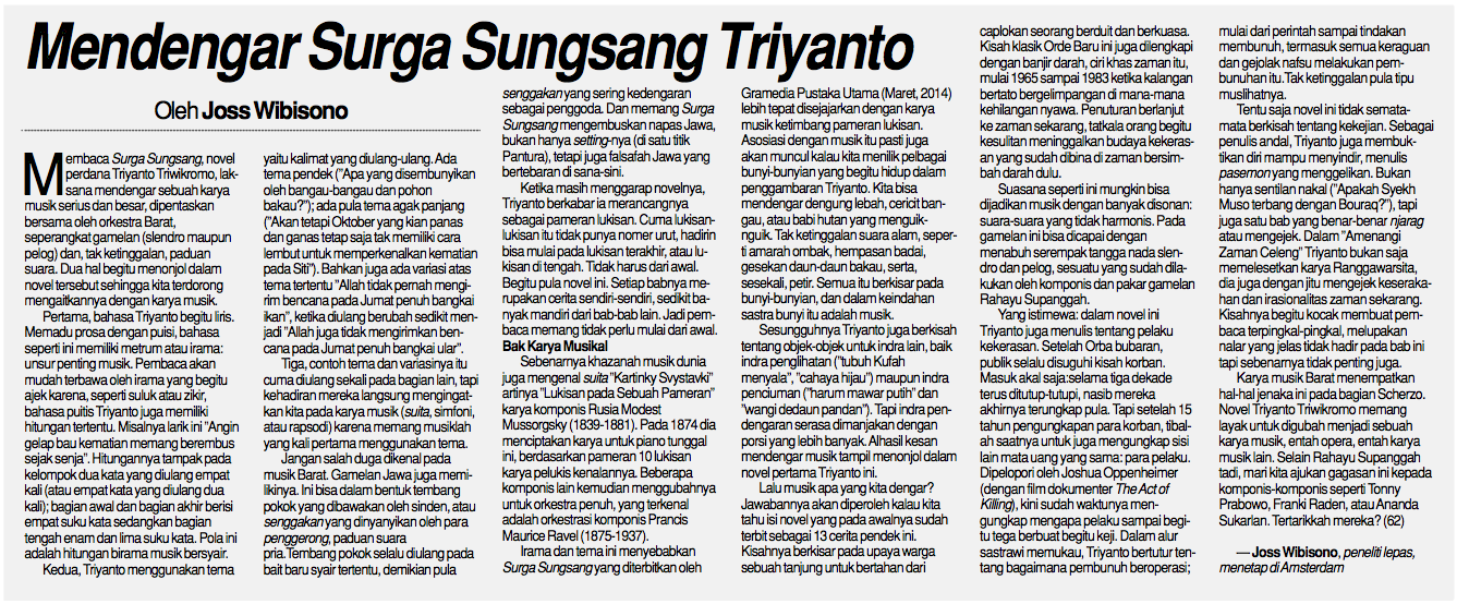 Membatja Surga Sungsang, novel perdana Triyanto Triwikromo, laksana mendengar sebuah karja musik serius dan besar — dipentaskan bersama oleh orkestra Barat, seperangkat gamelan (sléndro maupun pélog) dan, tak ketinggalan, sekelompok paduan suara besar. Dua hal begitu menondjol dalam Surga Sungsang sehingga kita terdorong mengkaitkannja dengan karja musik.