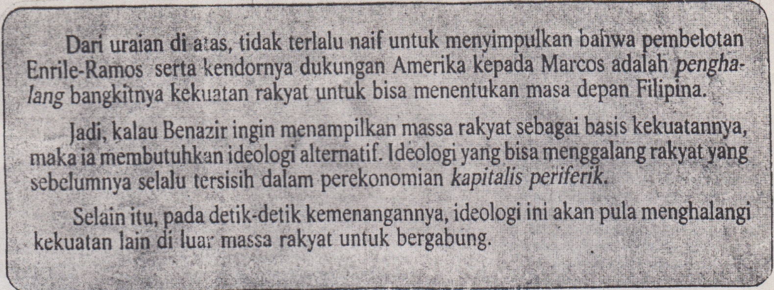 Dengan kata lain saja tetap jakin bahwa bukan massa rakjat jang semakin kuat (karena massa jang amat kuat ini setjara potensial sarat dengan konflik kepentingan) jang berhasil mentjopot Marcos, tapi aparatur negara jang makin lemah karena pembelotan Enrile-Ramos.