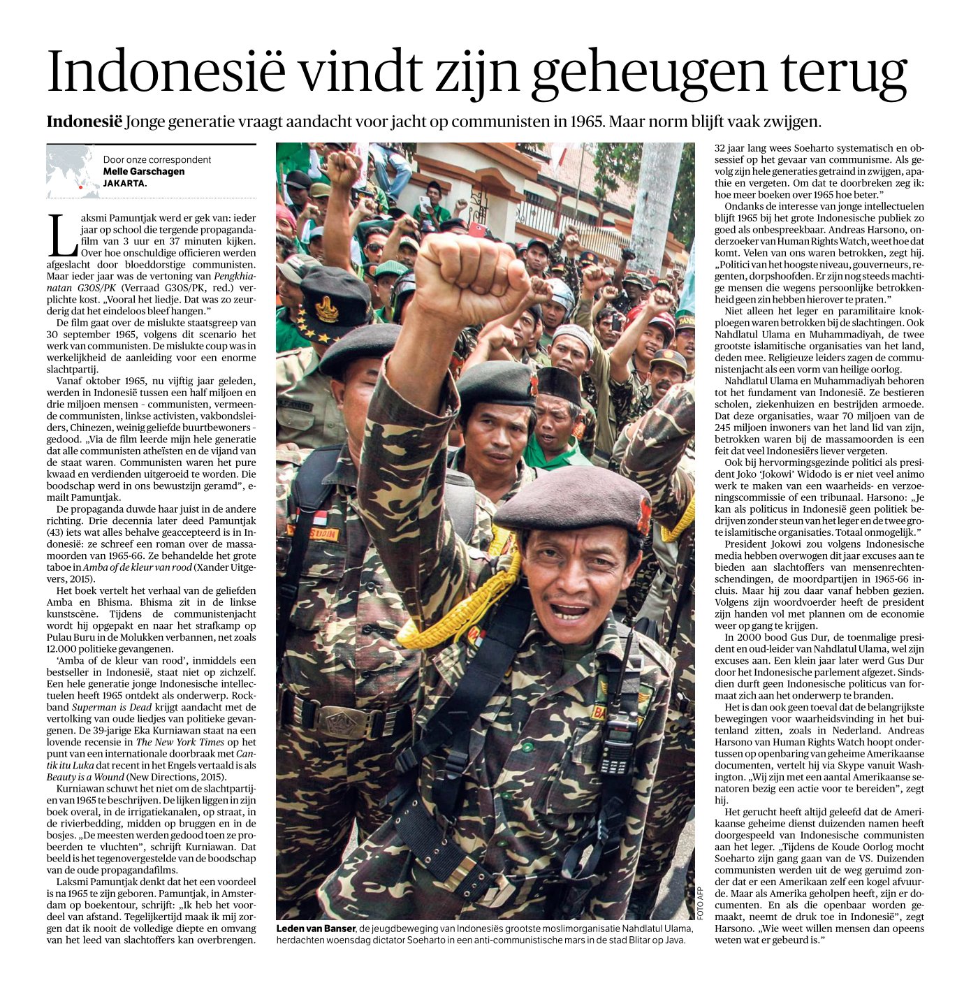 Pertentangan sudut pandang lama dengan sudut pandang baru terhadap G30S ini merupakan inti pemberitaan harian NRC Handelsblad. Pada edisi 1 Oktober 2015, dengan djelas koran sore terbitan Amsterdam ini menguraikan perbedaan pandangan antara chalajak umum (jang dibesarkan tiap tahun menonton film Pengchianatan G30S/PKI) dengan kalangan jang disebutnja “jonge intellectuelen” alias tjendekiawan muda. Dalam berita itu, tjendekiawan muda diwakili orang tiga orang, masing2 dua novelis jaitu Laksmi Pamuntjak dan Eka Kurniawan, serta peneliti Andreas Harsono.