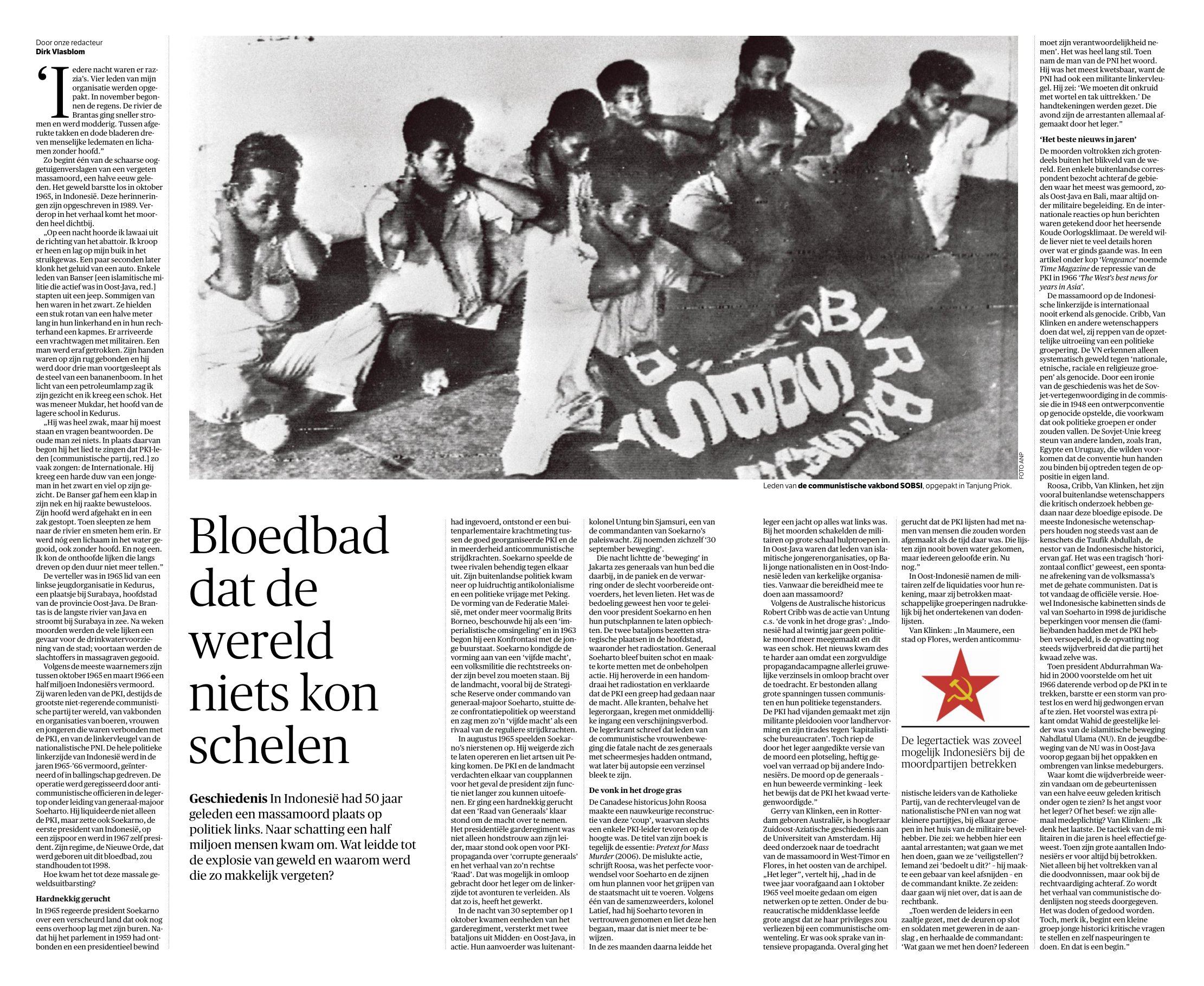 Pada edisi achir pekan 26-27 September 2015, rubrik ilmu pengetahuan harian NRC Handelsblad menurunkan laporan pandjang tentang pelbagai teori G30S jang selama ini sudah berkembang. Djudulnja “Bloedbad dat de wereld niet kon schelen” artinja “Bandjir darah jang tak dipedulikan dunia”. Menariknja teori2 ini berkembang di luar negeri, tidak di Indonesia sendiri. Maklum ilmuwan dan sedjarawan Indonesia belum djuga bisa benar2 membebaskan diri dari kungkungan orde bau, seperti bisa dibatja pada dua alinea berikut.