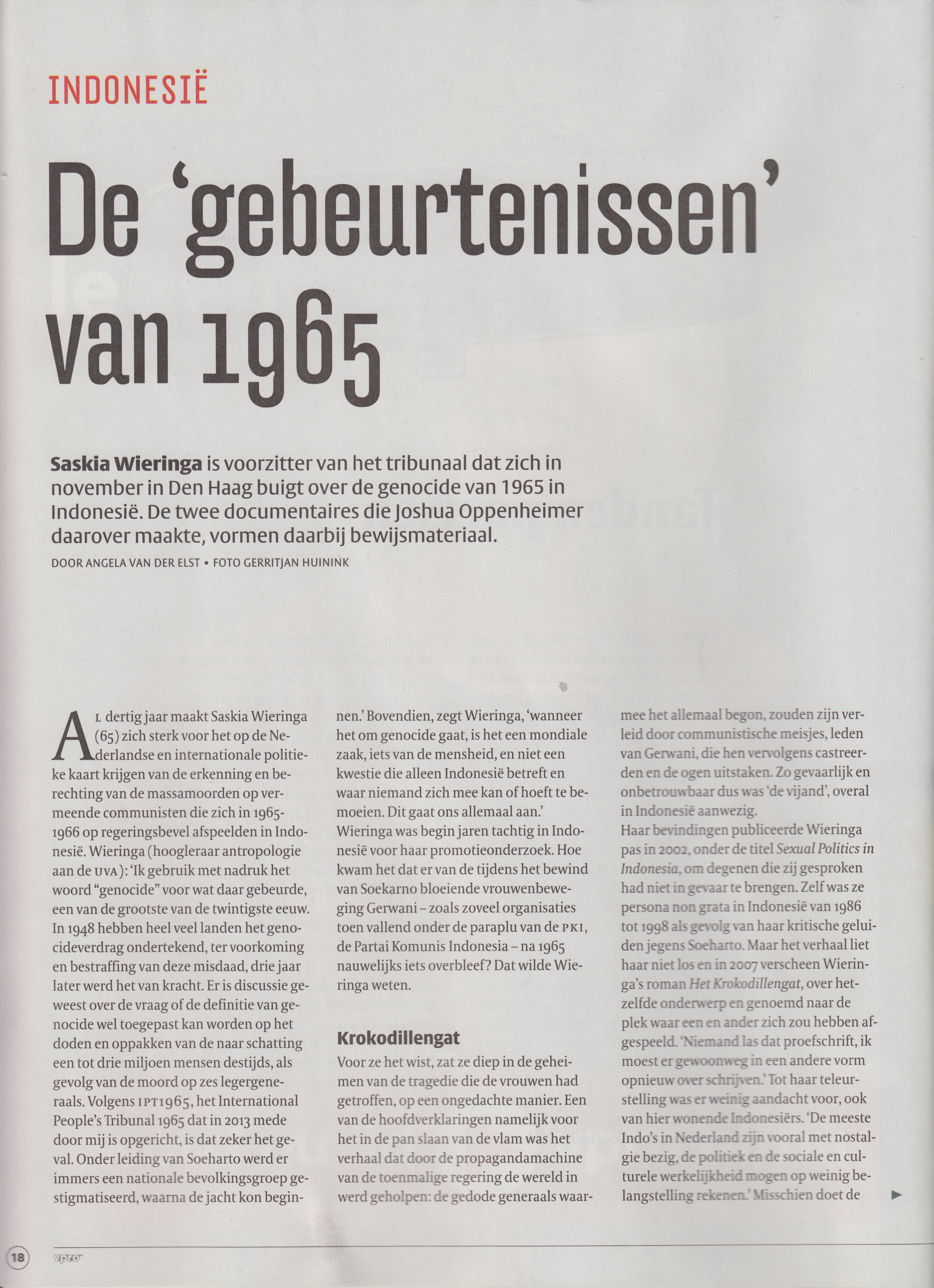 Selain dokumenter ini, organisasi penjiaran VPRO menajangkan dua dokumenter karja Joshua Oppenheimer tentang peran para algodjo pada pembantaian 1965. Dua malam ber-turut2, tanggal 30 September dan 1 Oktober 2015, chalajak Belanda berkesempatan menonton The Act of Killing (Djagal) dan The Look of Silence (Senjap). Mendjelang siaran, berkala panduan atjara jang dikeluarkan VPRO mewawantjarai Saskia Wieringa, gurubesar antropologi Universiteit van Amsterdam jang meneliti pemusnahan Gerwani, organisasi perempuan onderbouw PKI. Pasalnja, Wieringa memimpin apa jang disebut IPT65, singkatan International People’s Tribunal jang, November mendatang di Den Haag, akan mengadili kedjahatan terhadap kemanusiaan Indonesia itu.