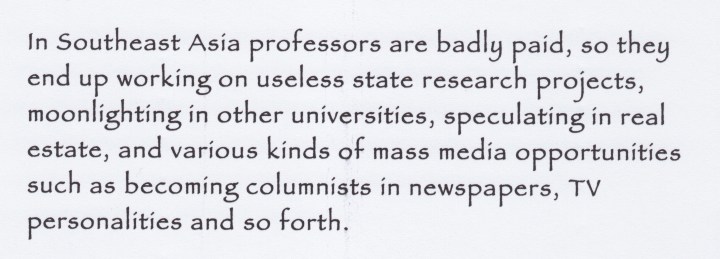 Most of these foreign students were financed either by private foundations or by foreign governments. These institutions —American, Japanese, Dutch, British, French, Canadian, etc. — had long term goals in mind, and dozens or even hundreds of students depending on their financial support. Foreign governments, with multiple interests in say Indonesia or Malaysia, had to think carefully about not upsetting the host government. Private foundations faced the same problem, how to encourage good research while not offending or upsetting the state apparatus. If they were too bold, they could be banned, their projects blocked, their relations with foreign affairs ministries, ministries of education, and above all intelligence apparatuses, very tricky. Under such pressures, it is quite understandable that these agencies and foundations felt forced to be very careful and conservative. You can thus easily see why their well-meaning programs rarely favoured public intellectuals, but rather emphasized technocratic or small-scale projects unlikely to create problems — not only for themselves but also for the youngsters that they sponsored and financed.