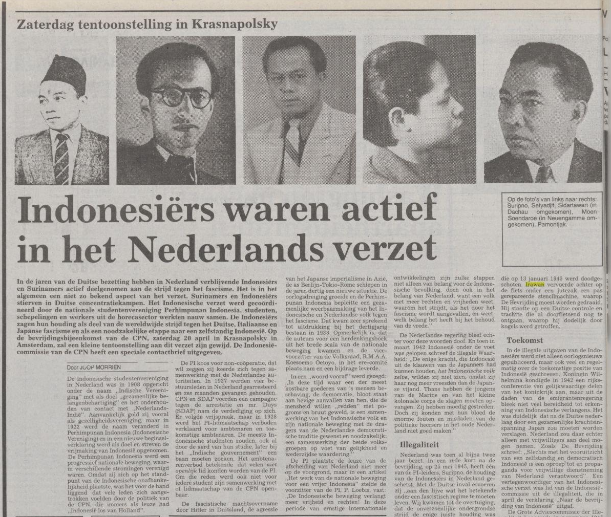 Koran »De Waarheid« edisi 19 april 1985 memuat artikel tentang peran aktif orang Indonesia dalam perlawanan