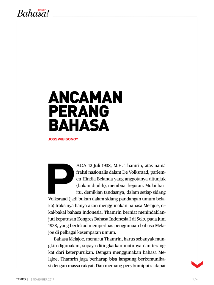 Pada 12 djuli 1938, M.H. Thamrin, atas nama fraksi nasonalis dalam de Volksraad, parlemen Hindia Belanda jang anggotanja ditundjuk (bukan dipilih) membuat kedjutan. Mulai hari itu, demikian tandasnja, dalam setiap sidang Volksraad (djadi bukan dalam sidang pandangan umum belaka) fraksinja hanja akan menggunakan bahasa Melajoe, tjikal bakal bahasa Indonesia. Thamrin berniat menindaklandjuti keputusan Kongres Bahasa Indonesia I di Solo, pada djuni 1938, jang bertekad memperluas penggunaan bahasa Melajoe di pelbagai kesempatan umum.