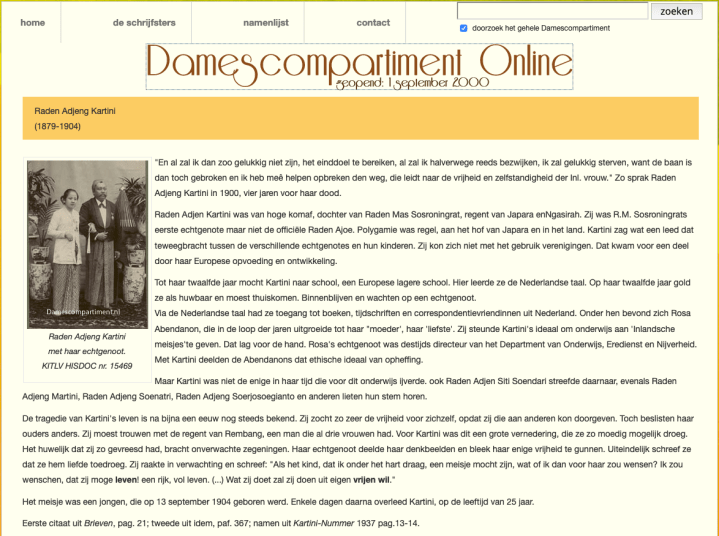 Pada kanon sastra Belanda itu, Kartini berada dalam apa jang disebut damescompartiment alias gerbong perempuan, bersama penulis2 perempuan lain, termasuk Soewarsih Djojopoespito, penulis perempuan Indonesia lain jang pada 1940 (12 tahun sesudah Soempah Pemoeda) menerbitkan novel dalam bahasa Belanda, berdjudul Buiten het gareel (di luar kendali), tentang perdjuangan kaum perempuan pada zaman pergerakan di tahun 1930an. Di sini djelas, kanon sastra Belanda tidak ambil pusing apakah Kartini penulis fiksi atau non-fiksi. Masuk kategori apa sebenarnja buku Kartini? Bukankah ia “hanja” menulis surat jang djelas bukan fiksi, bukan pula puisi? Bagi pegiat sastra Belanda itu semua tidak masalah. Jang penting bahasa Belanda Kartini indah, serta isi tulisannja, terutama tentang posisi kaum perempuan, djuga sesuatu jang baru pada zaman itu. Belum ada orang lain (termasuk orang Belanda) jang menulis tentang perlunja persamaan hak pria-wanita. Maka dari itu buku Kartini dinilai berbobot sastra.