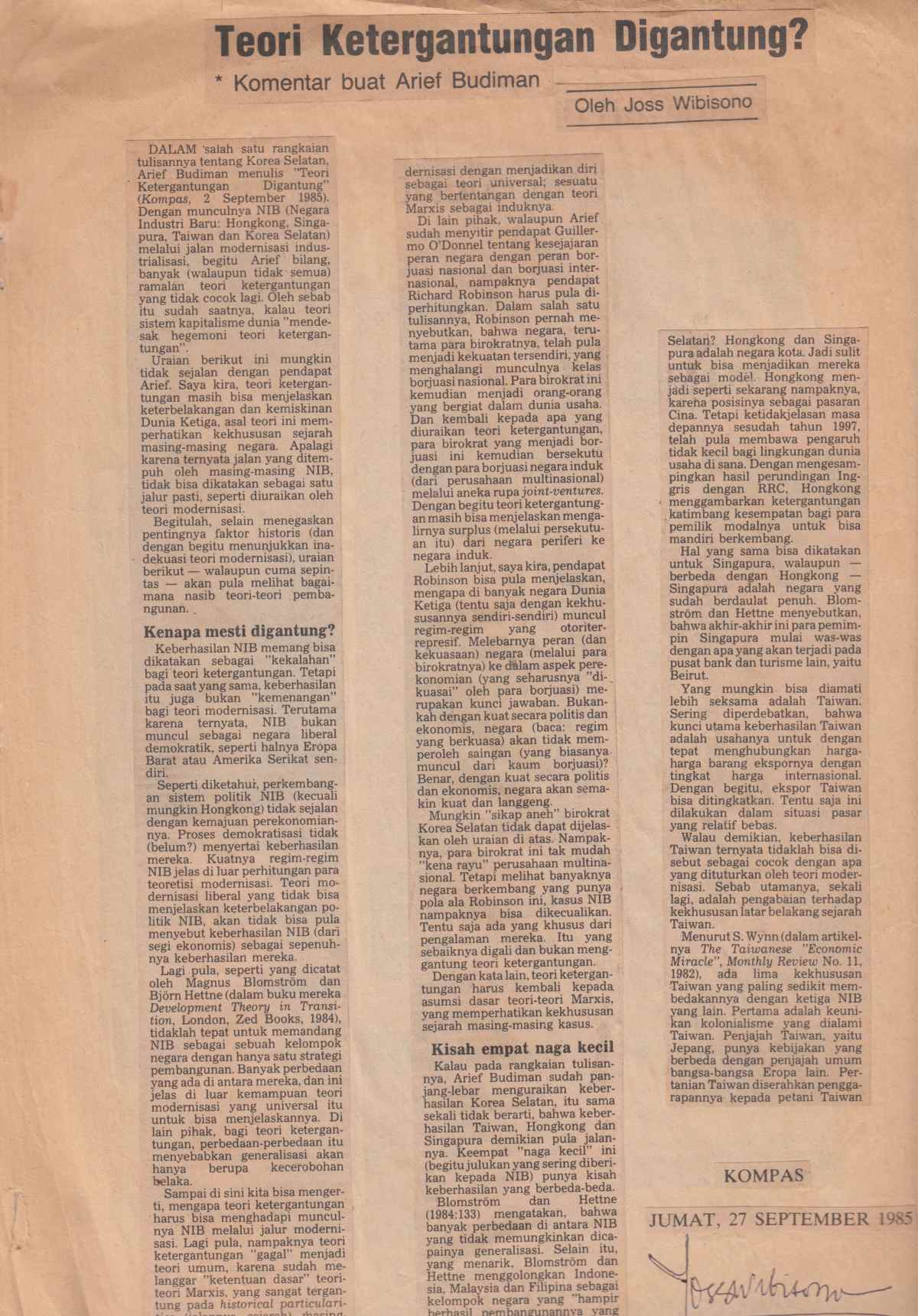 Aku ingat sekali, ketika mengambil mata kuliah “Sosiologi pembangunan” Arief Budiman jang waktu itu baru kembali dari sebuah seminar di Korea Selatan, mendorongku untuk menulis tentang teori ketergantungan. Dalam kuliah dia bahas pembangunan model kapitalisme di Korea Selatan dan model sosialisme di Korea Utara. Ternjata kuliah itu dia djadikan seri empat tulisan jang diumumkan oleh harian Kompas pada bulan2 agustus dan september 1985. Dia antusias banget, karena di Seoul dia bertemu djago2 teori ketergantungan dunia jang ternama, seperti Samir Amin, Guillermo O’Donnel dan Peter Evans. Korea Selatan waktu itu sudah tampak sukses membenahi perekonomiannja, sesuatu jang menurut pak Arief telah menggojahkan teori ketergantungan. Makanja, artikel terachir Arief Budiman dari empat seri itu berdjudul “Teori ketergantungan digantung” diumumkan oleh harian Kompas pada edisi tanggal 2 september 1985.