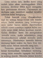 Djustru di situlah fatalnja, karena ketika saja membatjanja kembali, saja merasa telah membumbui kritik itu dengan kata2 kasar dan mungkin kedji; sehingga kritiknja tidak kelihatan. Saja sadar ini sebuah kesalahan. Dan sambil memohon pembatja supaja menganggap semua kata kasar jang ada pada surat saja itu tidak ada, saja djuga ingin mengenang pesan direktur SMA dulu. Betapa saja menghargai pesan beliau.
