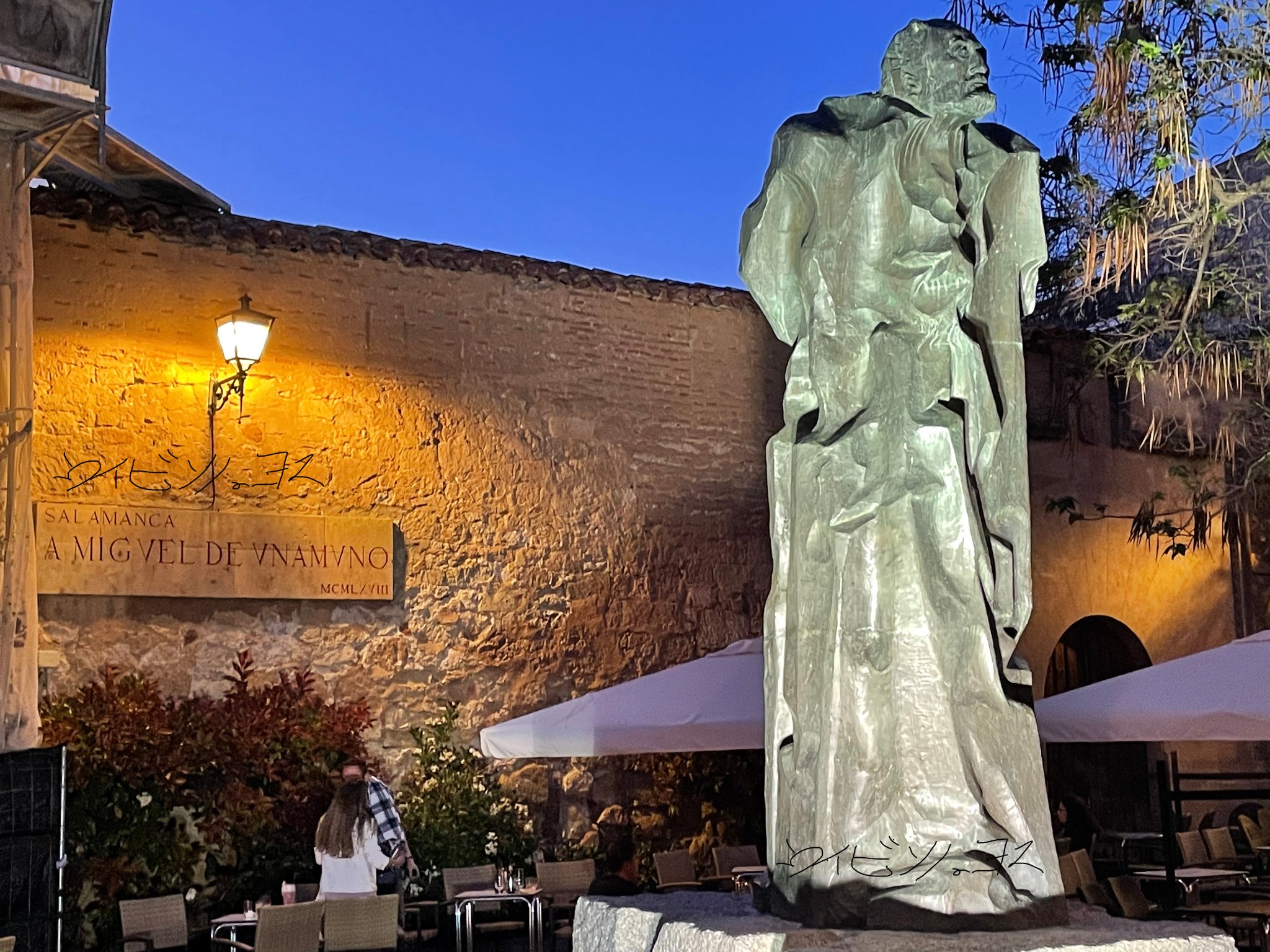 Miguel de Unamuno, tokoh kedua jang nama dan riwajatnja terpatri dalam gedung universitas tertua Spanjol ini, punja riwajat jang lebih dekat dengan kita. Maklum dia hidup antara tahun 1864 dan 1936. Pada tahun kematian Unamuno, 1936, di Spanjol bergolak perang saudara. Kaum republik jang menang pemilu pada april 1936, mengubah negara ini dari keradjaan mendjadi republik dan raja Alfonso XIII bukan tjuman meninggalkan tahta, dia djuga meninggalken Spanjol. Tapi pada bulan djuli 1936 djinderal Francisco Franco melantjarkan kudeta militer terhadap pemerintah republik jang terpilih setjara demokratis. Sebagai rektor Universitas Salamanca Miguel de Unamuno semula mendukung Franco jang diharapkannja bisa membereskan Spanjol dari porak poranda pemerintahan kiri. Tapi begitu dia melihat orang2 Franco terus melakukan pembunuhan kalangan jang dianggep musuh, termasuk rakjat biasa jang sebenarnja tidak punja pilihan politik tegas, dia menarik dukungan pada Franco.